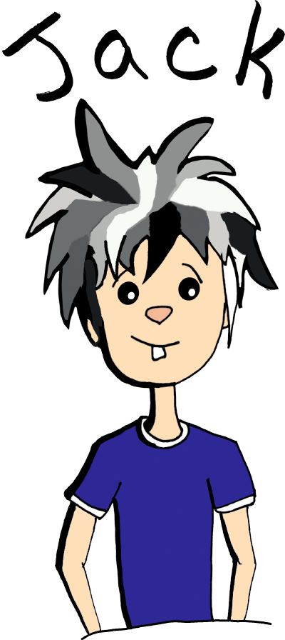 Jack Coney. Annie’s part-rabbit BFF. He is lean and pale with thin bunny-bones, large eyes, super fluffy hair in shades of black, grey and white, a twitchy bunny nose and giant feet. He lives next door to Annie, who moved in 8 years ago, and has always found her splice to be the epitome of awesomeness--it's a giant weapon she's allowed to bring anywhere she wants. What could be cooler than that? Jack already embraces the bunny part of himself and the extra energy and jumping skills it brings to the table, and feels confident in who he is, even if that includes being a jumpy scaredy-cat with bunny-like features that get him labeled “adorable” by random passersby. He is the middle child in a set of duodecaplets and spends as much time as he can at Annie's house to get a break from the chaos of his own household, not that his parents ever notice. How could they with so many kids? He's fiercely loyal, level-headed, and tender-hearted to a point where Annie has a tendency to trample his feelings and take him for granted (not that he'd ever say that aloud).